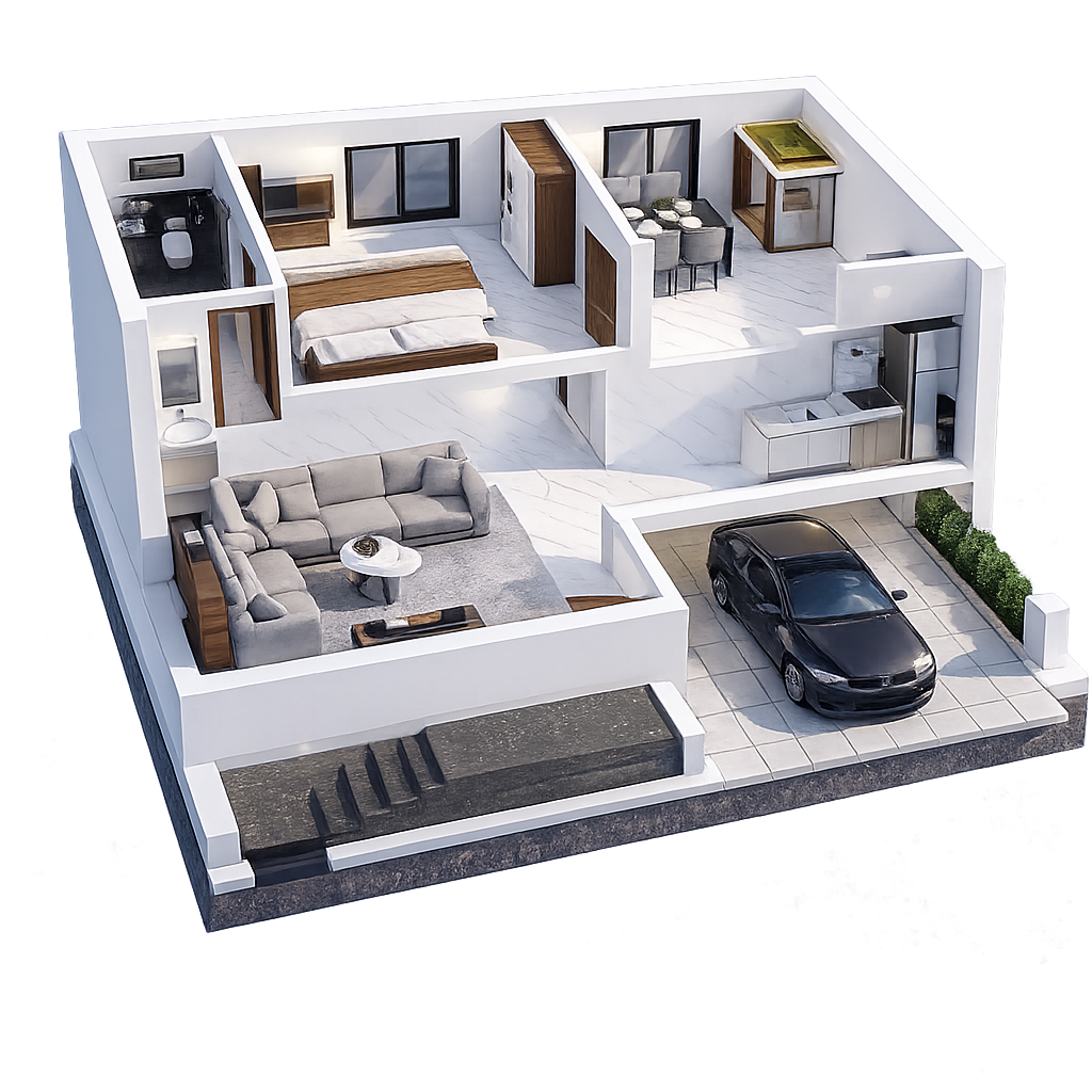 At the front, a dedicated car parking area provides secure and convenient vehicle space, while maintaining a clean and organized entrance.