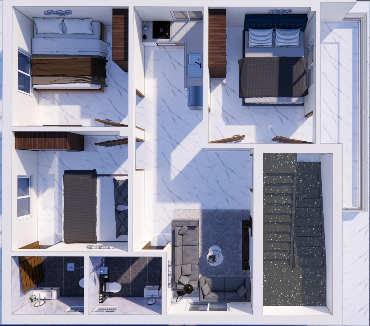 The layout also includes modern bathrooms, conveniently located to serve the bedrooms without disturbing the overall flow of the space. A key highlight of the first floor is the balcony area, which offers an open and refreshing environment, ideal for relaxation, morning coffee, or enjoying fresh air.