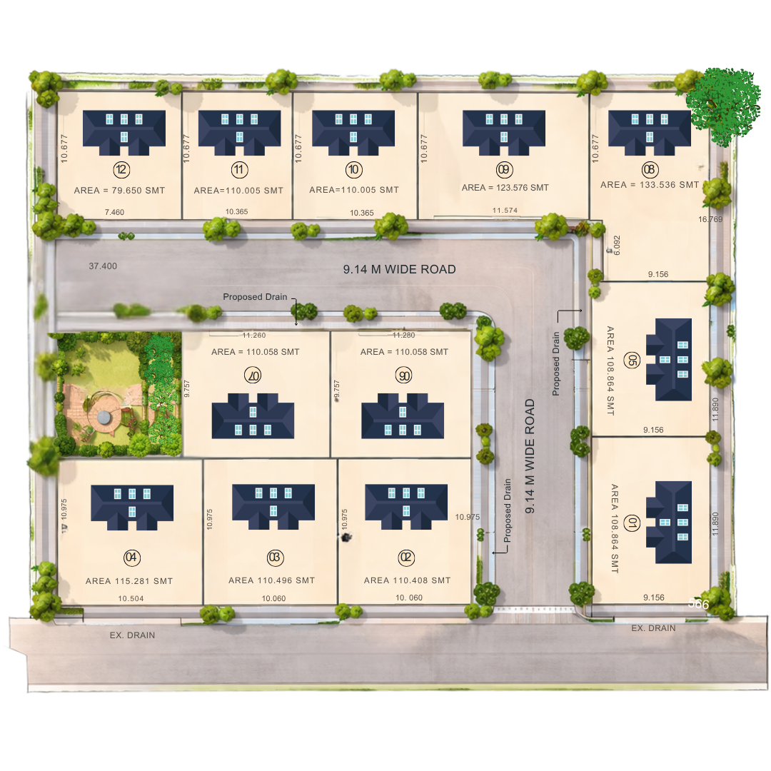Each plot is carefully positioned to maximize space, natural light, and privacy. The layout also includes a dedicated green and recreational area, creating a peaceful environment for residents.